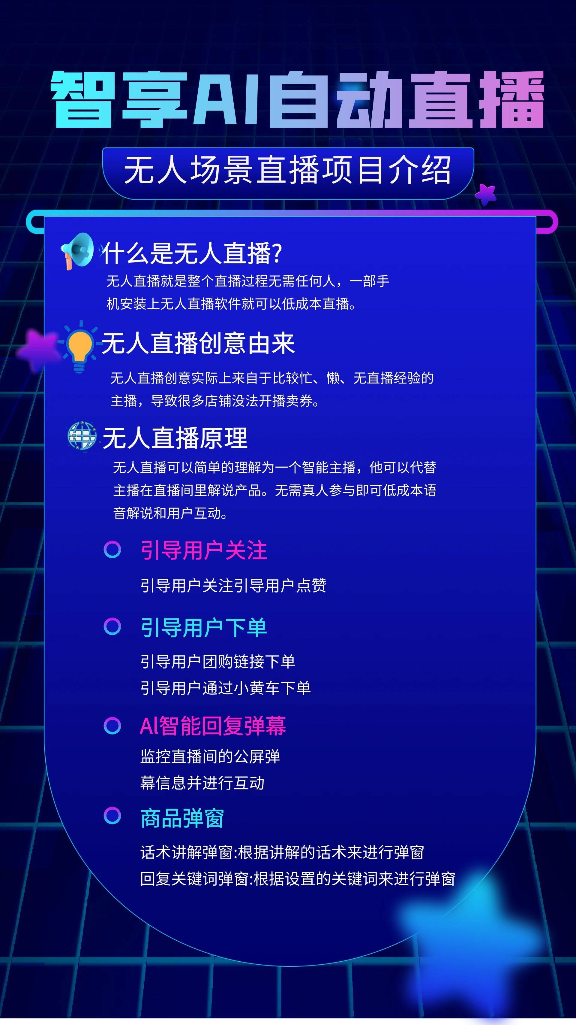 AI系统具备智能互能,实现“睡后收入”。不只降低了商家的运营成本,将为商家带来更多增加可能。响应速度仅0.15秒,系统内置违规词库及时过滤词汇,商家只需一部手机安拆曲播软件,大幅降低了曲播门槛和人力成本?